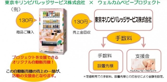 このたび、NPO法人こまちぷらすが事務局をつとめるウェルカムベビープロジェクトでは、東京キリンビバレッジサービス株式会社と共に新規事業を展開することになりました。地域の方が自動販売機で飲み物を購入すると、一定割合の支援金がウェルカムベビープロジェクトに入る仕組みができました。2016年7月29日(金)に「ウェルカムベビープロジェクト支援自動販売機」の第一号が戸塚区内で設置されます。