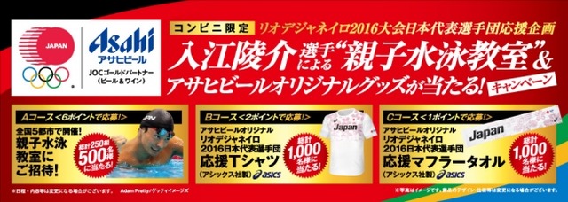コンビニエンスストアにてご購入いただいた『アサヒスーパードライ』(缶350ml・缶500ml)を対象としたキャンペーンです。各コースで必要なポイント(対象商品1缶につき1ポイントを付与)を集めていただき当社ホームページよりご応募いただくと、抽選で総計500名様(250組)を、全国5都市で開催する「入江陵介選手による“親子水泳教室”」にご招待します。あわせて、リオデジャネイロ2016日本代表選手団「応援Tシャツ」や「応援マフラータオル」が当たるコースも準備しています。皆様からのご応募お待ちしています!