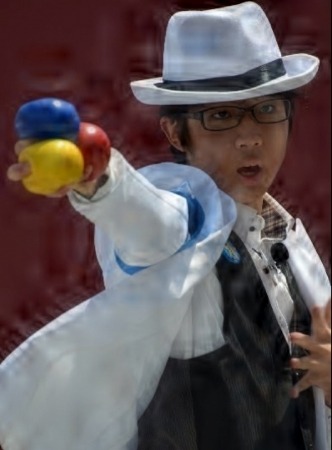 180センチの長身を生かした長い手足での”高速ジャグリング”と、オリジナルの”ダンスジャグリング”が大好評!