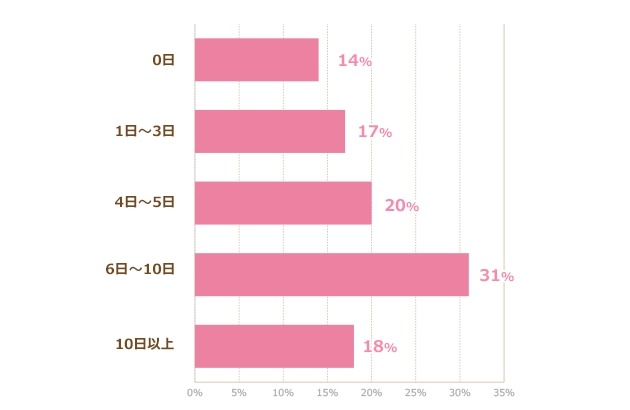 有給取得日数は、年間「6~10日以上」が31%で最多。一方で「0日」が14%
