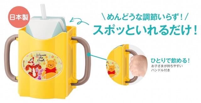 「面倒な調節もいらず、紙パック飲料をスポッといれるだけの特許機能※だから、お子さまが紙パックを直接握ることなく、一人でじょうずに飲むことができます!」