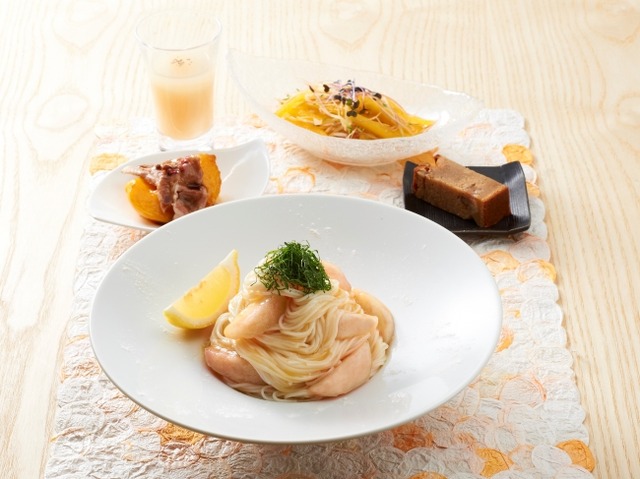 白桃に大葉の風味を添えて、和風にアレンジした爽やかな素麺がメイン。セットには、黄桃の千切りに茗荷を加え、柑橘風味のドレッシングで食べる新感覚サラダや、焼き桃とバルサミコ酢のソースが絶妙な組み合わせのポーク