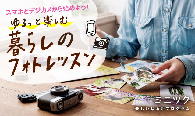 「ゆるっと楽しむ暮らしのフォトレッスンプログラム」は、初心者が自宅で気軽に始められて、少しずつカメラの基本知識と技術を見につけ、フォトブックの編集まで楽しめるようになる6ヵ月レッスンプログラムです。