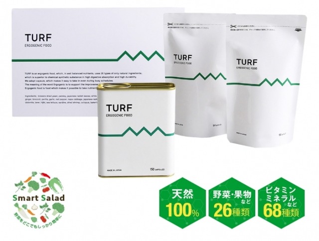 発売から1年が経過し、ご支持をいただいてきたエルゴジェニックフード「TURF」は、スポーツと健康への意識が高まる中、「簡単に栄養バランスを良くしたい」というお客様のニーズにお応えすべく、従来の製品を見直し1日10粒でハードワーカーが不足するビタミン・ミネラルをサプリメントではなく食事として、補給できる製品の開発に成功しました。
