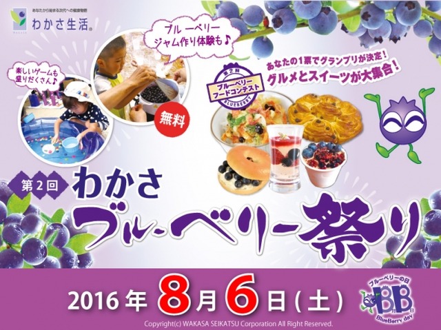株式会社わかさ生活は、「ブルーベリーの魅力をもっとたくさんの人に伝えたい」との想いから、昨年初めて“第1回 わかさブルーベリー祭り”を開催いたしました。今年も京都三条会商店街にて、2016年8月6日(土)に“第2回 わかさブルーベリー祭り”を開催いたします。ブルーベリーを使ったフードコンテストやブルーベリージャムづくり体験など、ブルーベリーが楽しめる企画が盛りだくさん! ぜひご来場ください。