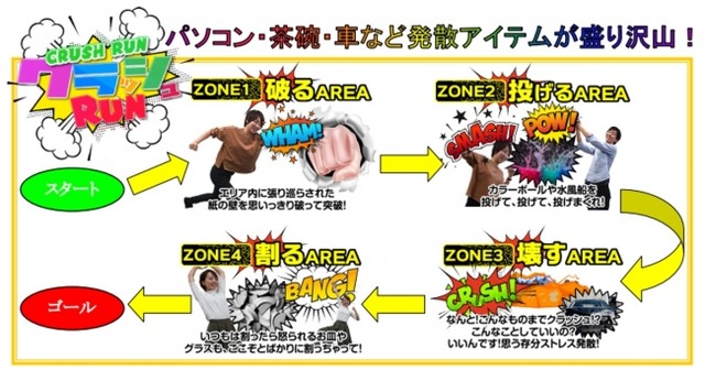 日常では体験できない「破壊」でのストレス発散を目的とした新型障害物競走を初開催!パソコン・携帯電話・皿・茶碗・車・紙・障子などを投げる、たたく、引き裂く等々の方法で破壊しつつゴールを目指します。日頃壊したくてもなかなか出来ないストレス発散アイテムの数々をご用意いたします。完走後は、最高の爽快感に満たされること間違いなし!豪快!痛快!クラッシュRUNでストレス発散できるハウステンボスへぜひお越しください。