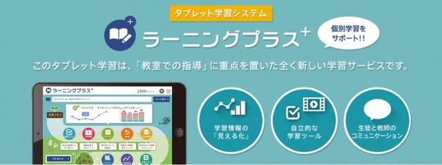 「ラーニングプラス+」は、タブレットを活用した学習システムで塾や予備校の「教室での指導」に重点を置いた全く新しい学習サービスです。教室でのテストや家庭学習の成果を全て取り込み、教室での指導現場で生徒一人ひとりの学習進捗度や習熟度を「見える化」し、個別学習をサポートします。生徒の学力アップを図り、入塾希望者を増やしたいとお考えのご担当者様には必見のサービスです。
