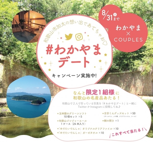 株式会社エウレカ(本社:東京都港区、代表取締役CEO:赤坂優)が運営する、カップル専用アプリ「Couples(カップルズ)」(https://couples.lv/ )と和歌山県和歌山市は、2016年8月9日より、全国のカップルを対象に、和歌山市加太でのSNS画像投稿で地元の名産品が当たるキャンペーン「#わかやまデート」を実施いたします。