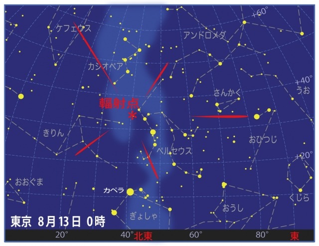 図は8月13日0時ころの夜空北東の空の様子です。流れ星はカシオペア座の下、ペルセウス座の左肩のあたりから放射状に飛び出します。しかし、流れ星はあらゆる方向に飛び出すので、広く空全体を見るようにすると、流れ星を観測することができます。