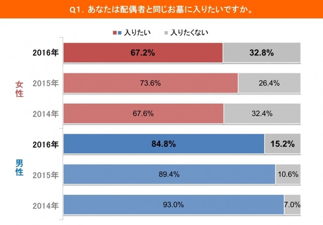 ・女性のうち32.8%は「配偶者と同じお墓に入りたくない」と回答しました。女性の半数ながら、男性の15.2%は同様の回答で、毎年増加を続けています。(Q1)