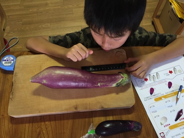 「3種のなす食べ比べ!カレーグラタン」では、研究材料として、真っ白い“白なす”、通常の2倍以上の大きさの“シフォンなす、普通のなすの3種類を研究材料として用意。見た目が大きく違う3種のなすを、計ったり、切ったり、焼いたりしながら、“なぜ同じなすでも見た目が違うのか?”“焼いたらなぜ色が変わるのか?”などを研究シートのクイズに答えながら勉強することができます。