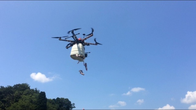 ドローン本体に開閉操作が可能な専用ボックスを取り付け、操縦機から遠隔操作を行う。