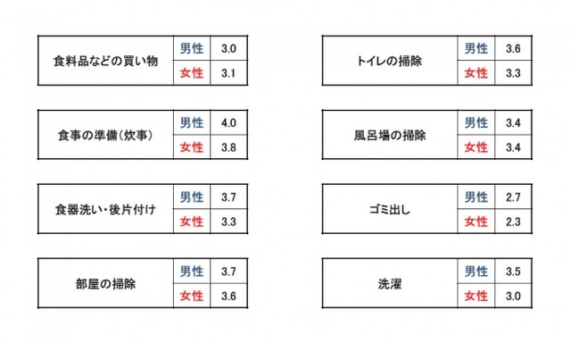 まずは男女別の家事の大変さの評価から。家事の種類ごとに大変さを5点満点で評価してもらい、その平均値を算出しました。