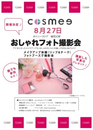 コスメのSNSアプリケーション(iOS、Android)とコスメのお試しイベント『cosmee』(コスミー)を運営する株式会社Medy(以下、Medy)が、『おしゃれフォト撮影会 by cosmee』をソニーストア 福岡天神で開催。