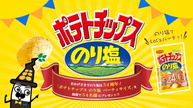 今までもこれからも皆様の笑顔とともにあるお菓子でありたいという思いを込め、2016年は「コイケヤポテトチップス のり塩」の発売54周年にかけて、抽選で54名に「コイケヤポテトチップス のり塩 パーティサイズ」(1袋240g/6袋入り)まるっと1箱をプレゼントするキャンペーンを実施します。家族や仲間で集まる際のお供として、まるごと1箱の「コイケヤポテトチップス のり塩 パーティサイズ」をお楽しみください。