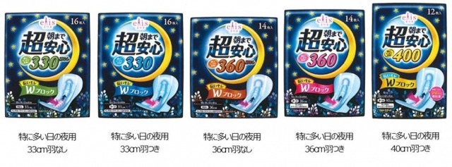 そこで「elis(エリス)朝まで超安心」は、排血口部と臀部の2つの吸収ポイントのフィット性を向上させることで、その場で経血をスッと吸収して「伝いモレ」をW(ダブル)ブロックする新機能を付加します。また、夜用ナプキンで肌ざわりを重視する生活者が多いことから、新たに「瞬間吸収やわらかシート」を採用し、吸収スピードはそのままに肌ざわりを改善することで、朝までモレの不安なく、快適に過ごしたい女性たちを応援します。