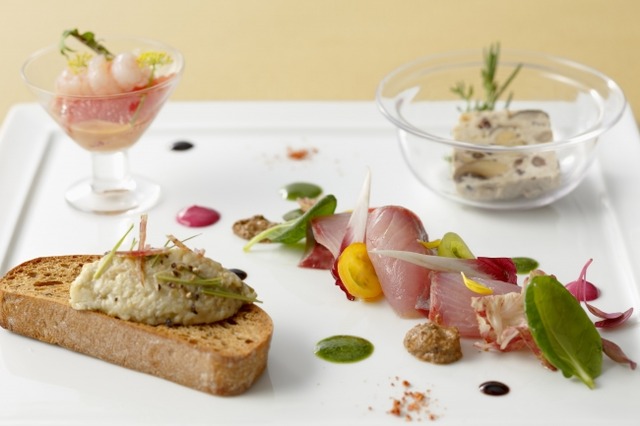<前菜> 茸とチキンのテリーヌ/ヒラマサのカルパッチョ / 茄子のキャビア風とチョリソ / 甘海老とパンプルムース ガラムマサラ風味のアンショワイヤード