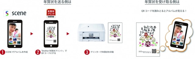 ブラザー工業株式会社(社長:小池利和)の国内販売子会社であるブラザー販売株式会社(社長:三島勉)は、リプレックス株式会社(社長:大中邦彦)の写真整理アプリ「Scene(シーン)」と連携し、スマホに撮りためた想い出の写真をQRコード(※1)にして年賀状にプリントする新機能「想い出いっぱい年賀状」を搭載したスマホアプリ「Brother 年賀状プリント(※2)」のサービスを2016年11月から開始する。