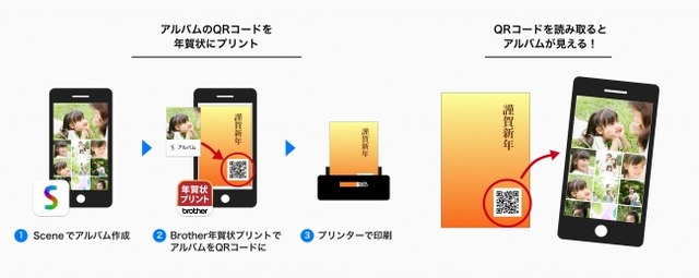 「想い出いっぱい年賀状」は、「Scene」で作成した想い出のアルバムを、「Brother年賀状プリント」からQRコードとして年賀状にプリントする機能です。アルバムの写真はクラウドに保存され、年賀状を受け取った人はQRコードを読み取るだけで、写真がたっぷり詰まったアルバムをすぐに表示できます。