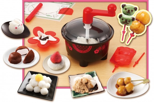 また、ごはんの他にも上新粉や白玉粉の生地を使ったいちご大福や、付属のおだんご型を使用することで、くまの形のおだんごなど、さまざまなバリエーションのもち生地の和菓子を作ることができます。生地をこねる作業をポット内で行うため、材料を散らかすことなく調理を行えることが特徴です。お月見やお正月など、これからの季節行事に合うクッキングトイです。