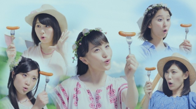 富士山の麓にある、緑豊かな高原で「御殿場高原あらびきポーク」を手に取り、アウトドアパーティーを楽しむ「ももいろクローバーZ」の面々。