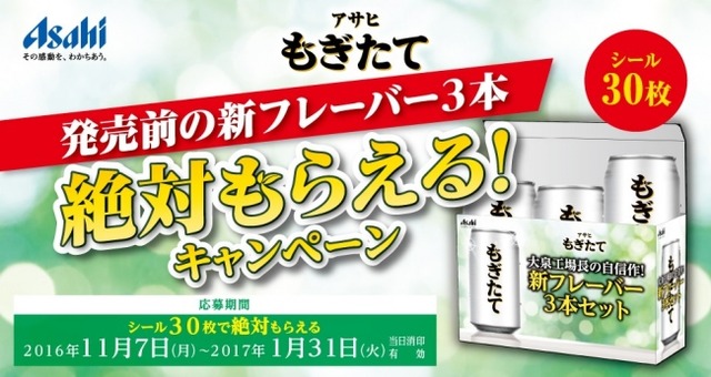 アサヒビール株式会社(本社 東京、社長 平野伸一)は、『アサヒもぎたて新鮮レモン』『アサヒもぎたて新鮮グレープフルーツ』『アサヒもぎたて新鮮ぶどう』『アサヒもぎたて新鮮オレンジライム』(各缶500ml、缶350ml)の対象商品に貼付されているシールを30枚集めると、もれなく「アサヒもぎたて」の発売前の新フレーバー(缶350ml×3本)が「絶対もらえる!キャンペーン」を11月7日(月)から開始します。