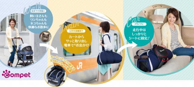 徒歩の移動はカートで、電車やバスでの移動はエケバッグで、マイカーでのお出かけはトラベルフィックスを利用して、と3つの新製品を組み合わせて利用することができ、より便利で快適なペットライフをお過ごしいただけます。
