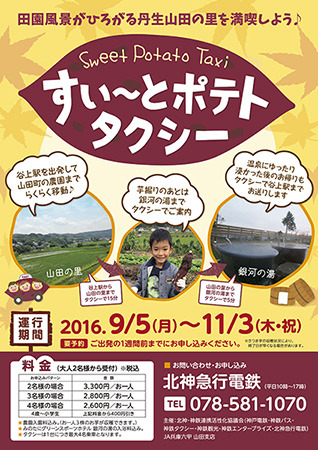 「すい~とポテトタクシー」の出発地となる谷上駅は、神戸市営地下鉄の三宮駅から北神急行線直通運転で約10分。また、「丹生山田の里」は昔ながらの田園風景が広がり、源平史跡が点在するエリアでもあります。当協議会では、今後も都会にお住まいの方々に「丹生山田の里」の魅力的な観光スポット等をご案内し、ご利用していただくことで、交流人口を拡大し、神戸市北区の地域活性化と公共交通機関の利用促進を図ってまいります。