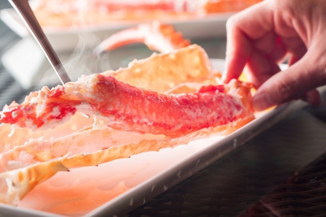 日頃のご愛顧に感謝して特別にご用意する“スペシャルコーナー”では、「紅ズワイガニのボイル」と「網走のいくらの醤油漬け」をフリースタイルでご提供いたします。北海道と言えばコレ!の贅沢な二品をお楽しみください。さらに、通常のブッフェではご提供が難しい豪華な一品として、“プラチナディッシュ”に、タラバガニやアブラガニなどの「オホーツク産 蒸しカニ 丸ごと1本」【お1人様につき1皿・大人の方限定】をスタッフがお席までお持ちいたします。