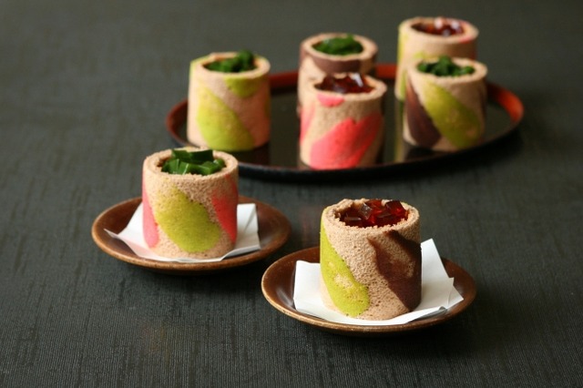 模様をあしらったスポンジをロールして湯呑みに見立てた「湯呑みケーキ」は、抹茶味・ほうじ茶味の2つの味をご用意。ほんのりココア風味のスポンジの中には、軽やかな口どけの大納言入りムース(抹茶ムース・ほうじ茶ムース)を詰め、清涼感あるお茶のゼリー(抹茶ゼリー・ほうじ茶ゼリー)を飾りました。さわやかなお茶の風味をお楽しみいただけるよう、あえて甘さは控えめに仕上げております。日本茶、紅茶、コーヒーなど、どんな飲み物ともよく合います。