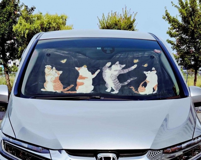 キャンプなどアウトドアレジャー、大型ショッピング施設の駐車場などでの車探しは大変。でもこのニャンシェードがあればひと目で自分の車もわかるし、戻ってきたときの車内温度を抑えてくれます。ドライブ先でのちょっとした休憩での目隠しにもなるし、暑さも疲れもいやしてくれるニャンシェード、まだまだ暑いこれから、車のフロントガラス用にいかがでしょうか?