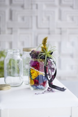 第一回の開催となった今回は、サンジョルディフラワーズ ザ・デコレーターの人気商品で、NYで人気に火がついたメイソンジャーサラダからヒントを得た「メイソンジャーフラワー」を製作しました。サラダでお馴染みのメイソンジャーを使い、色とりどりのアーティフィシャルフラワーや、鮮やかなビジュー、自然素材を自由に組み合わせて作るメイソンジャーフラワーのアレンジメントです。