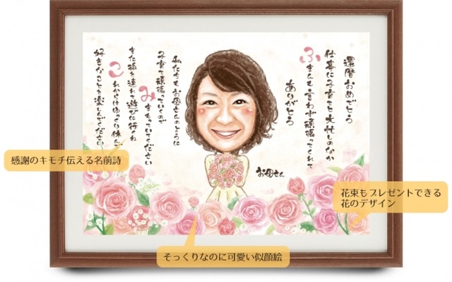 フラワーサンクスボードは、敬老の日のプレゼントや還暦祝い、誕生日プレゼント、退職祝い、結婚周年祝い等のギフト用商品として、プレゼントの定番である「花束」をプレゼント相手の似顔絵が受け取っているイメージのサンクスボードになります。プレゼント相手への気持ちを伝えるオリジナルの「名前詩」も記載でき、感謝の気持ちを伝えることができる新しい形のギフトです。さらに、本当に花束を受け取っている感覚となる仕掛けとして、木製のフレームから花の香りがします。