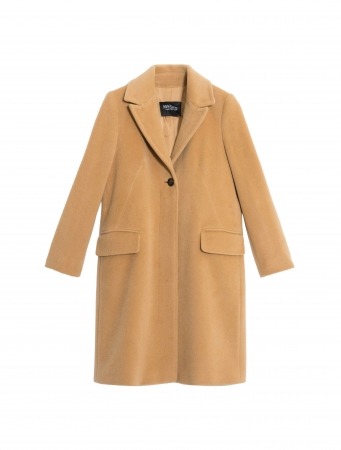 ウール ビーバーを使用したコート。ストレートカットで、ややルーズフィット。ラペル付きの襟が施されていますフラップのあるポケット付き。バックにスリット、袖口にもボタン付きの小さなスリットが入り。
