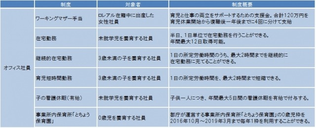 オフィス社員向け「ワーキングペアレンツサポートプログラム」: 半日・1日単位の在宅勤務(年間最大12日)、1日の所定労働時間のうち最大2時間までの継続的在宅勤務、子育て・キャリア形成両立のための支援金など