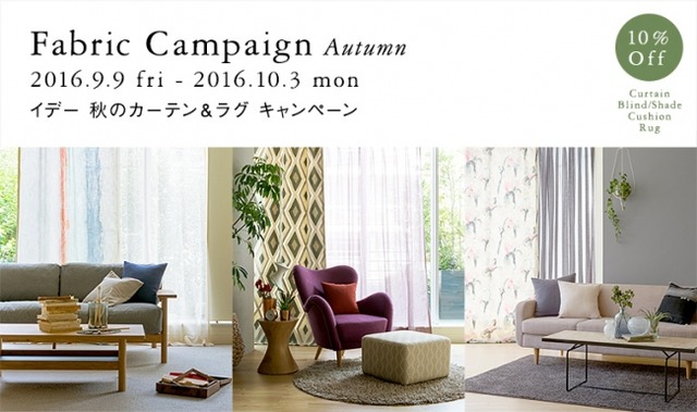 イデーでは、カーテンやブラインド、クッションカバーやラグ、カーペットなどのファブリック製品を10%OFFの特別価格でご提供する「秋のファブリックキャンペーン」を開催します。洗練されたデザインと高いクオリティを併せ持つヨーロッパのテキスタイルブランドの2016 年秋冬最新コレクションを中心に、国内外から厳選したおすすめのファブリックを種類豊富にご用意いたしました。少し早い秋の訪れを窓辺から取り入れてはいかがでしょうか。あわせて、窓周りのセレクトから家具のレイアウトまで、インテリアのトータルコーディネートのご相談を無料で承っております。ぜひ、ご利用ください。