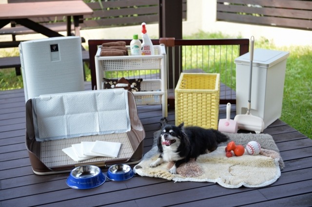 玄関ゲート、トイレトレー、トイレシート、食器、うんち回収袋、ダストBOX、用ビニール袋、マット、タオル、シャンプー、ウェットティッシュ、消臭剤、粘着テープ、ビニール手袋、カゴ、ウェットティッシュ、ティッシュ、スコップ、おもちゃ など