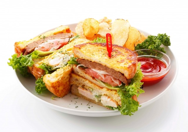 海老とアボカドにハンバーグ、トマト、玉ねぎ、グリーンリーフをサンドし、ボリュームたっぷりのIvorish特製クラブハウスサンドに仕上げました。お好みでケチャップにディップもしていただけます。