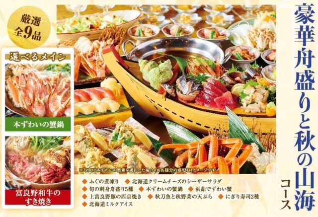 職人が作る旬の料理メニューと大勢でも絶対に満足できるボリュームと名高い北の家族の宴会コース。中でもこの秋は「本ずわいの蟹鍋」と「富良野和牛のすき焼き」からメインを選べる豪華なプランが「北の家族」の一押しコースです。全9品の「秋の山海コース」は、ずばりお値段3,800円。メインは選べるお鍋2種で1つは北の家族の代名詞でもある「本ずわい蟹」を惜しみなく使った「本ずわいの蟹鍋」、もう1つは贅沢の極み「富良野和牛のすき焼き」です。この選び難いどちらかのお鍋をメインに据えた後は、ふぐの煮こごりから始まり、旬の刺身舟盛り5種、秋刀魚と秋野菜の天ぷら、にぎり寿司2種と厳選された全9品のお料理が並びます。これで3,800円(2時間飲み放題+1200円)はいつでも納得のコストパフォーマンスなのに、この秋は通常飲み放題+1,200円とプレミアム飲み放題(生ビール・ホッピー・八海山・黒霧島・隠し蔵)+500円が付いて、通常5,500円のコースが、特別価格4,980円と超お値打ち価格。年末の忘新年会の下見にも是非どうぞ!更に日~木曜日は通常2時間の飲み放題が3時間(※ご予約時に必ずお申し出ください。※ご予約時の状況によりお断りをする場合がございます)の“ゆったり”としたお時間でご利用できます。その他、【北海道満喫コース】2,800円や【秋の味覚コース】2,300円等、どこを取っても料理も価格も絶対に間違いない北の家族の秋の宴会プランです。(各宴会コースに+1,200円にて2時間飲み放題)