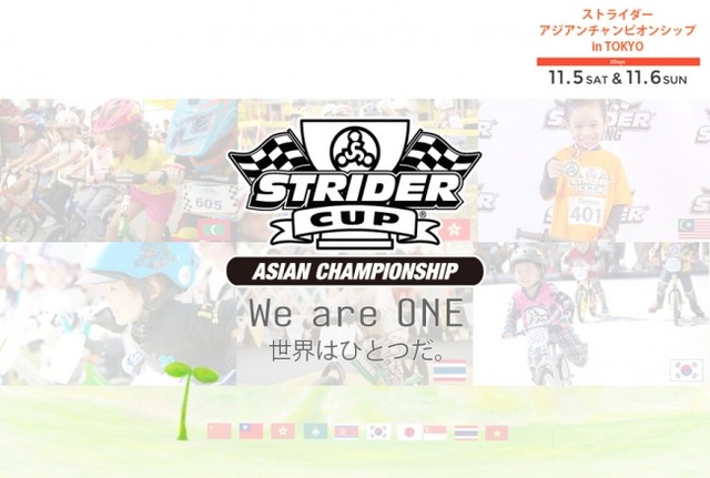 ストライダージャパン(日本正規輸入元:株式会社豆魚雷)は、2歳から乗れるペダルなし二輪車「ストライダー」を使ったレースイベント『STRIDER CUP』の初のアジア大会となる『STRIDER CUP ASIAN CHAMPIONSHIP <We are ONE 世界はひとつだ。>』を11月5日(土)、11月6日(日)に東京・お台場で開催いたします。また開催にともない、2歳~5歳の選手のエントリーを9月7日(水)正午12時30分より公式サイト( http://www.strider.jp/cup/entry_asiancup.html )で受付を開始します。