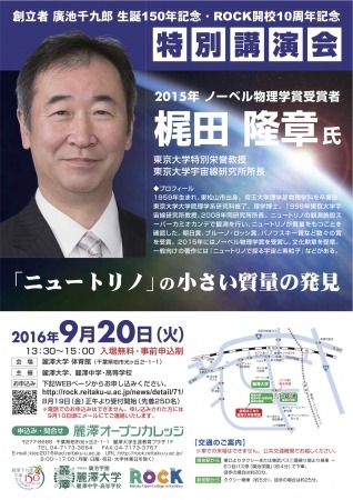 麗澤大学では、来る2016年9月20日(火)に、創立者廣池千九郎生誕150年記念及びROCK(麗澤オープンカレッジ)開校10周年記念として、2015年ノーベル物理学賞受賞者・梶田隆章教授を講師にお招きし、特別講演会を開催いたします。