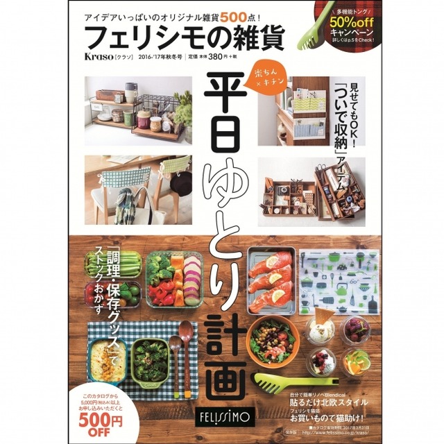株式会社フェリシモ(神戸市中央区)は、新カタログ「Kraso 2016-’17年 秋冬号」を発刊、全国書店にて9月9日より発売を開始しました。 “平日ゆとり計画”と題して、作り置きや下ごしらえに便利な料理アイテム、気軽にDIYが楽しめるお部屋のコラージュアイテム、使う、しまうをスムーズにしてくれるインテリア収納など、多数の新アイテムを掲載。発刊を記念して、「つかめるすくえる便利なトング」が半額・50%OFFで買える「いっしょ買いキャンペーン」をはじめ、初回お試し・特別価格などお得な特典ももりだくさん、暮らしを彩るオリジナルアイテムの数々を楽しんでいただける一冊です。