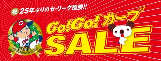 広島パルコでは、広島東洋カープの25年ぶりとなるセ・リーグ優勝を祝し、優勝翌日の9月11日(日)よりGO!GO!カープSALEを開催しています。1994年に本館がオープンした広島パルコとしては、初めての優勝セール開催です。一部ショップでは優勝にちなんで25%OFFのセールを開催するほか、カープコラボアイテム販売などで、全館を挙げてカープのセ・リーグ優勝をお祝いします!