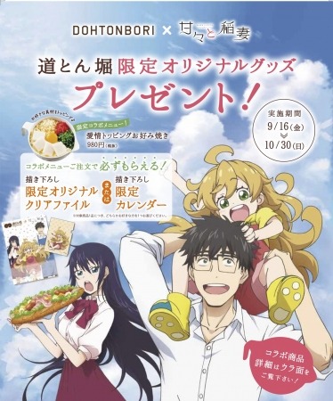 お好み焼きチェーン道とん堀は、9月16日(金)から人気アニメ「甘々と稲妻」とコラボレーションした「愛情トッピングお好み焼き」をオリジナルグッズ付きで期間限定販売します。(http://loveokonomiyaki.jp)