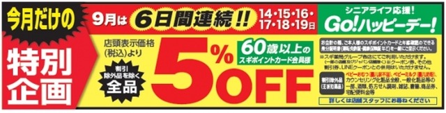スギ薬局では、かねてより毎月15・16・17日を「シニアライフ応援!Go!ハッピーデー!」とし、60歳以上のスギポイントカード会員様を対象に、割引除外品を除く、ご購入の全品が5%OFFになるサービス(※注)を実施していますが、今月は9月19日(祝)が「敬老の日」であることから、14日(水)から19日(日)までに期間を拡大いたします。