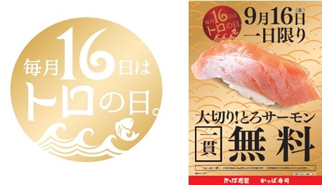 第6弾の「トロの日」では、「大切り!とろサーモン」を5月以来、改めて選定いたしました。定番のメニューとしても大人気のネタであるサーモンを、贅沢に大切りにすることでとろける脂のりをたっぷりと感じて頂けます。そして、本商品を2016年9月16日(金)一日限定で、全国のかっぱ寿司にご来店いただいたお客様全員へ一貫プレゼントいたします。