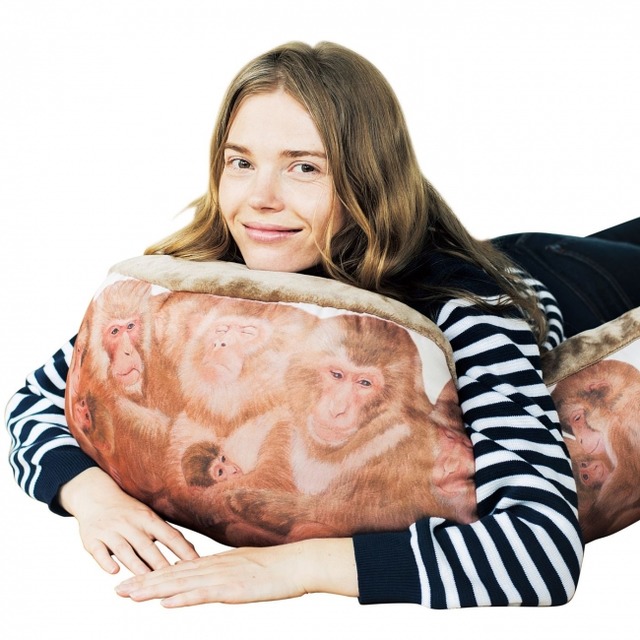 ニホンザルがおしくらまんじゅうしてつくるサルだんご。これをクッションにしてみたら、いろんな姿勢でらくちんだった! 大勢の子分たちに囲まれる、ぬくぬくのボスザル気分を味わってみよう。寝転がって、ひざにのっけて、もたれかかってと、いろいろな使い方ができます。