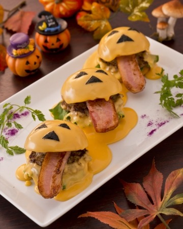 土間土間のバルバーガー第3弾。見た目にかわいい1品。ゴーストのあっかんべーに思わず笑顔に。2種のチーズを合わせて作ったソースとベーコンで作った舌がポイント。