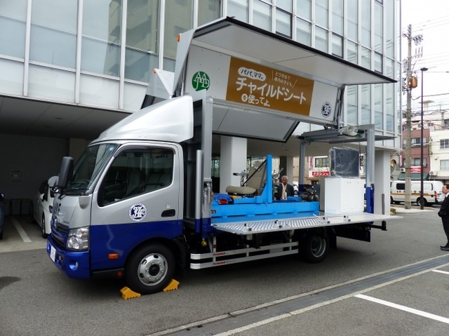 チャイルドシートコンビンサーは、トラックの荷台部分に設置された座席にダミー人形を乗せたチャイルドシートを装着し、空気圧で押し出すことにより、最高で時速20kmの衝突を実演することができます。