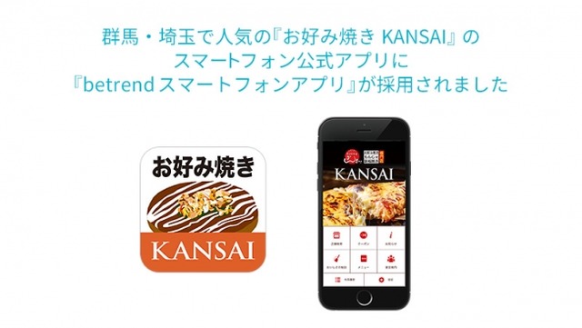 スマートCRMプラットフォーム『betrend』を提供するビートレンド株式会社(本社:東京都港区、代表取締役社長:井上英昭、以下 ビートレンド)の『betrend スマートフォンアプリ』が、群馬・埼玉県に『お好み焼き KANSAI』を16店舗展開する株式会社コラボレーション(本社:群馬県、代表取締役:山崎健一、以下 コラボレーション)の、『お好み焼きKANSAI公式アプリ』(9月16日(金)にリリース)の構築に、採用されました。